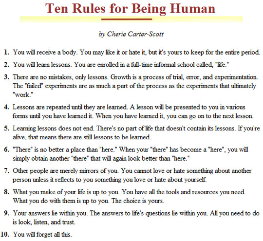 Ten rules about being human Posted on July 5, 2011 by motivatingdaily /phil Rate this:Motivate your friends! Share on Facebook (Opens in new window) Facebook Share on X (Opens in new window) X Share on Reddit (Opens in new window) Reddit Share on Tumblr (Opens in new window) Tumblr Share on LinkedIn (Opens in new window) LinkedIn Like Loading... Related
